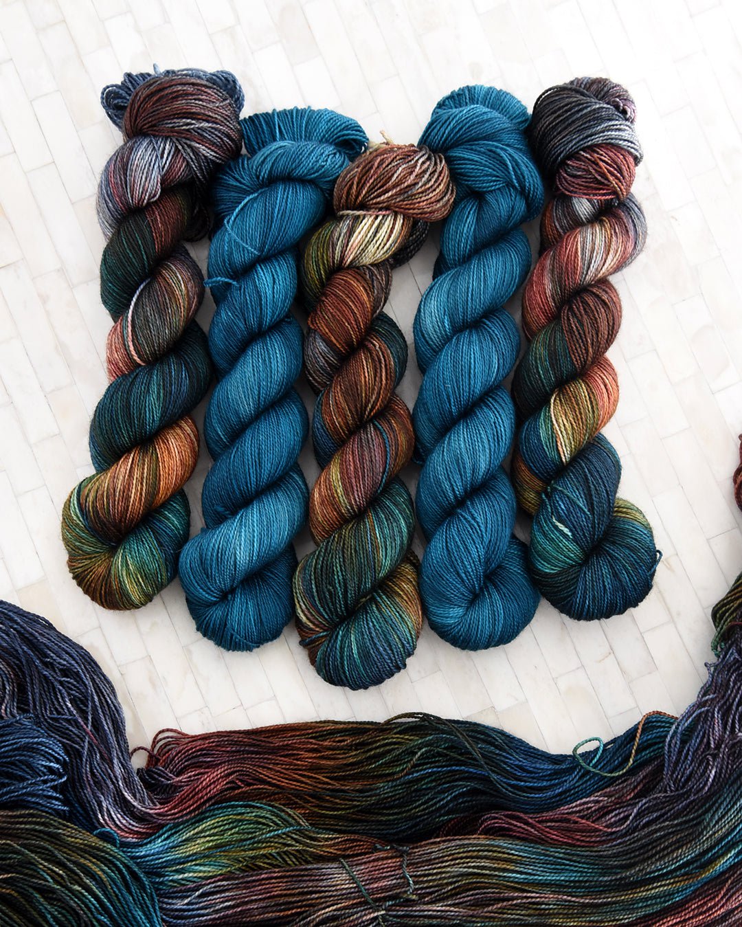 Each skein is kettle dyed in tones of the same color creating deep, intense colorways with enough variation to show off patterned stitches well.